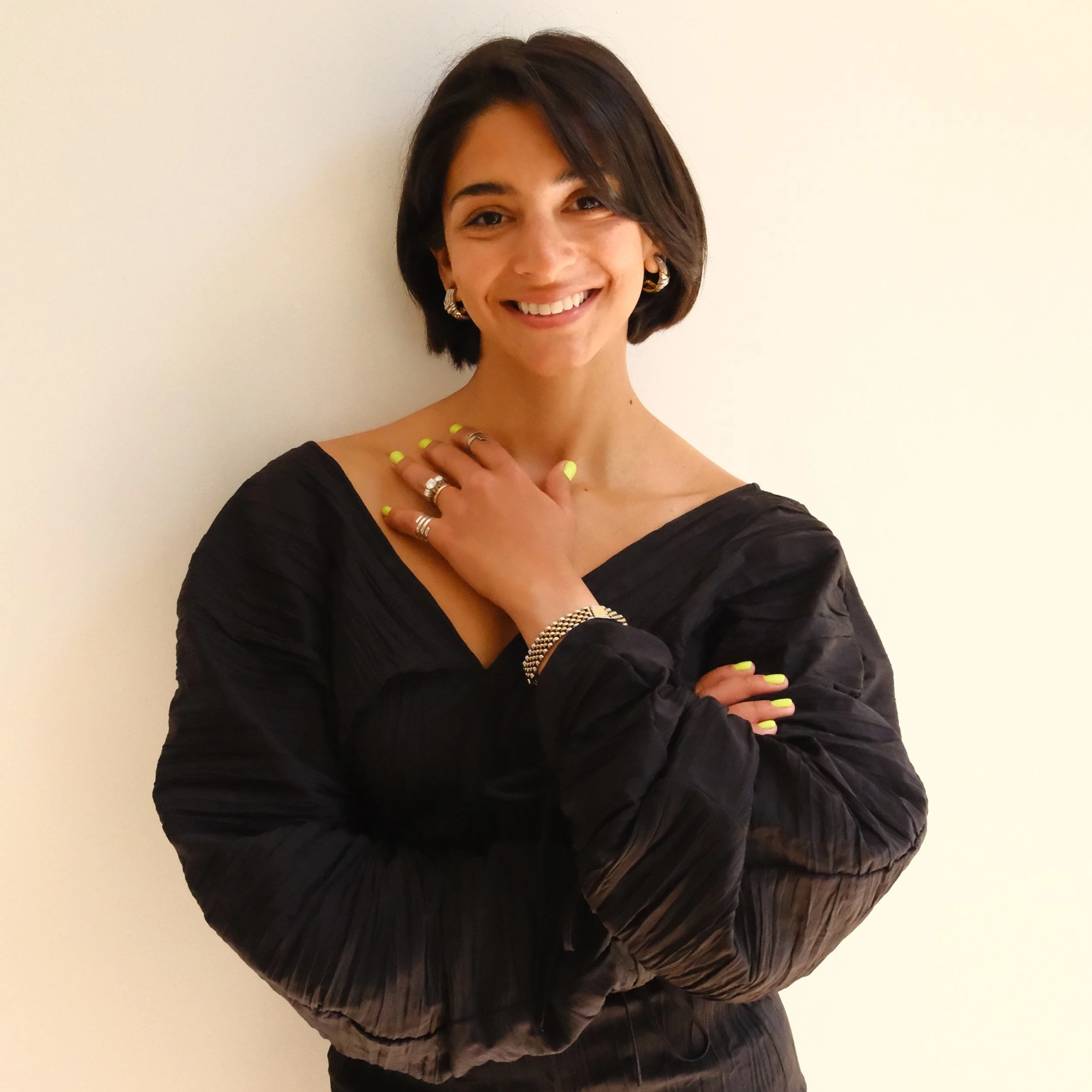 Warm, welcoming portrait of Shahwar, founder of espacio ROOH, smiling with grounded confidence in a black dress, standing against a soft, light background.